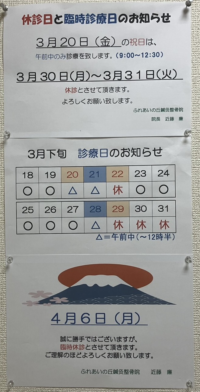 2026.03.19 診療時間の変更のご案内 fokass 臨時診療日と休診日のお知らせ Tweet Share +1 Hatena Pocket RSS feedly Pin it 臨時診療日と休診日のお知らせ 3月20(金)の祝日は、 午前中のみ診療致します。 3月30日(月) 3月31日(火) 4月 6日(月) 休診とさせて頂きます。 Tweet Share +1 Hatena Pocket RSS feedly Pin it